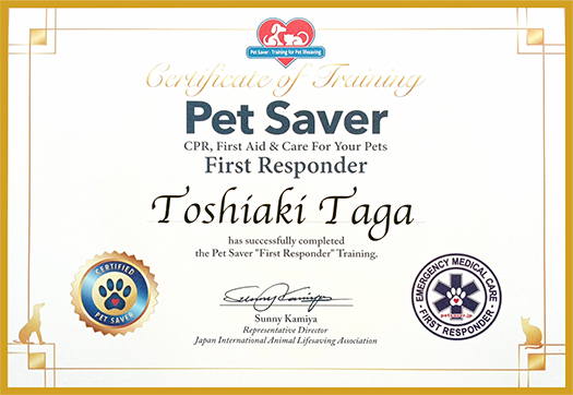 ペットセーバー:一般社団法人 日本国際動物救命救急協会(主催)および 一般社団法人 日本防災教育訓練センター(共催)の認定資格。ペットの健康と安全を守るための救命救急法・救急疾患対応・健康生活支援などの知識と技術を習得するプログラム構成です。